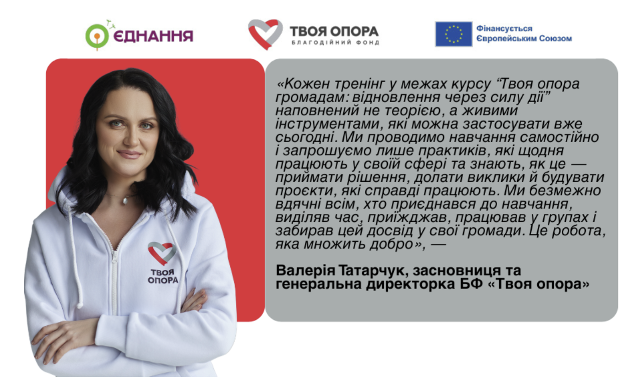 У серпні 2025 року благодійний фонд «Твоя опора» відкрив набір на менторську програму в межах освітнього курсу «Твоя опора громадам: відновлення через силу дії» — практичної програми для громадських організацій і благодійних фондів, які хочуть не лише навчатися, а й реалізовувати власні проєкти.